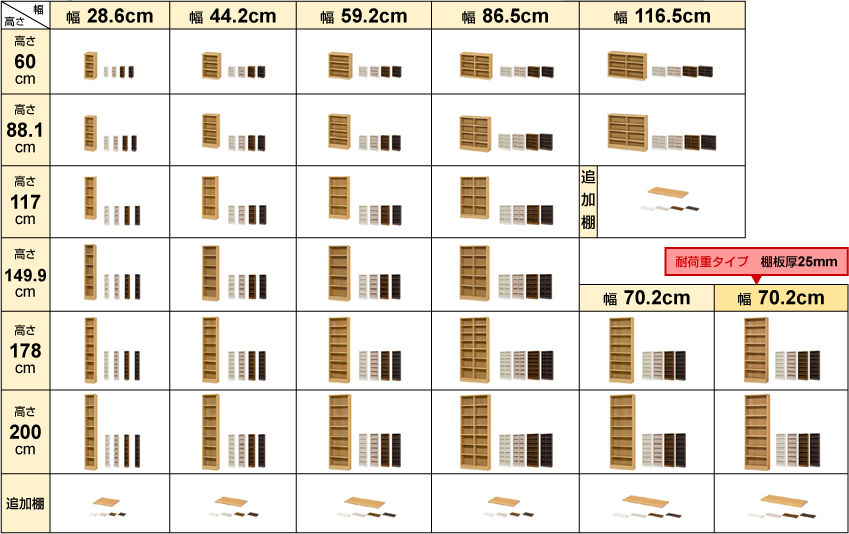 棚板厚さ25mmの「タフタイプ」高さ178/200cm幅70.2cmのみタフタイプをご用意しております。