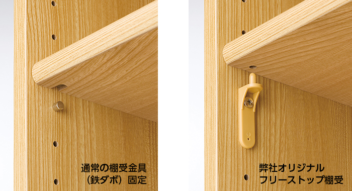 通常の棚受金具(鉄ダボ)での固定と併せて、オリジナルの「フリーストップ棚受」を付属しています。