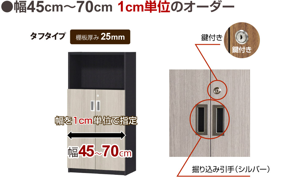 幅1cm単位でオーダー可能。どんなスペースにもぴったり収まる、オーダーメイドの収納庫です。