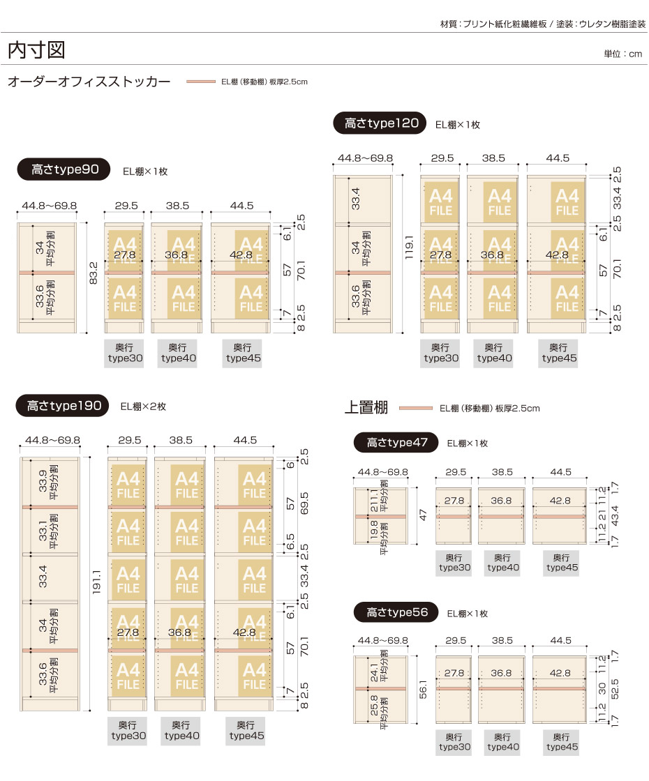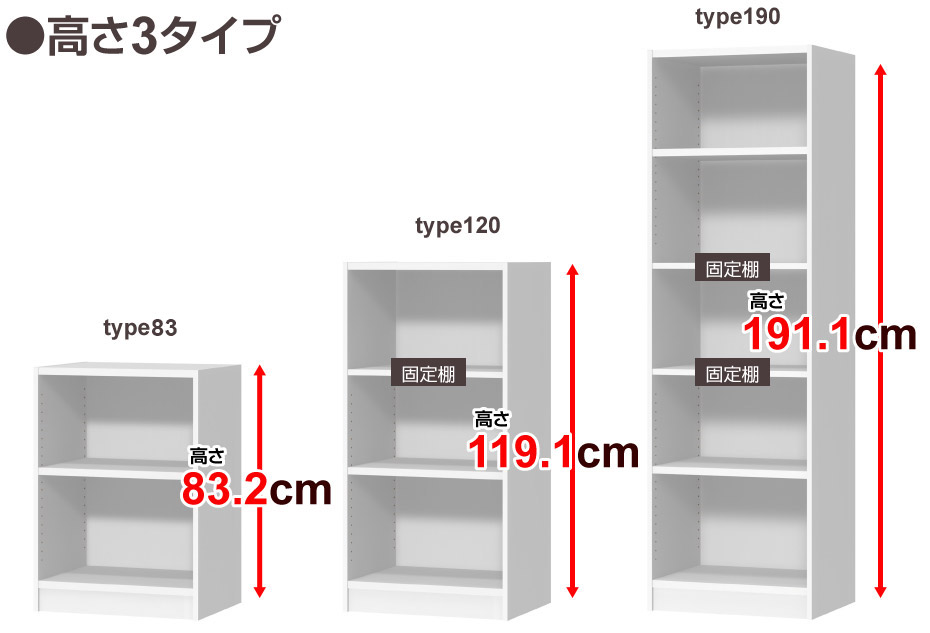 ●高さは3タイプ。棚板間は、A4縦サイズがきっちり収まるサイズです。